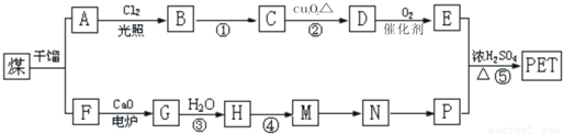 现以煤的干馏产品A与F为质料制备PET,生产流程如图所示.其间A为烃,含碳元素的质量分数为90.6%,其蒸气的密度是空气密度的3.66倍,能使酸性高锰酸钾溶液褪色,但不能使溴水褪色.M分子里一切原子共平面.